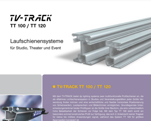 Das TV-TRACK System besteht aus einem Aluminiumprofil, das einerseits über einen Kanal für Laufwagen verfügt, an die Scheinwerfer und andere Geräte angehängt und verfahren werden können. Andererseits wird die Strom- und Signalversorgung der Geräte in dem Profil realisiert.